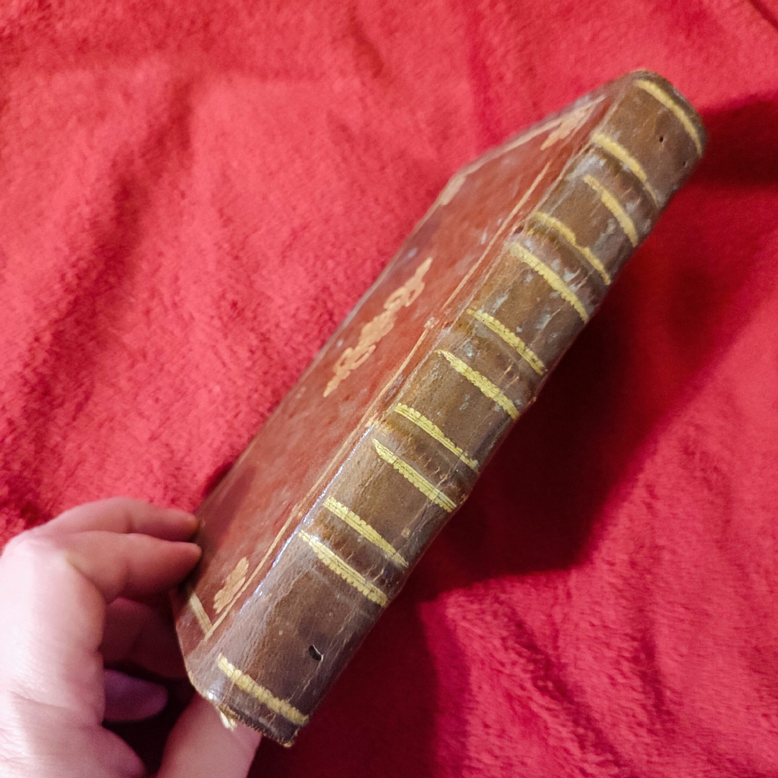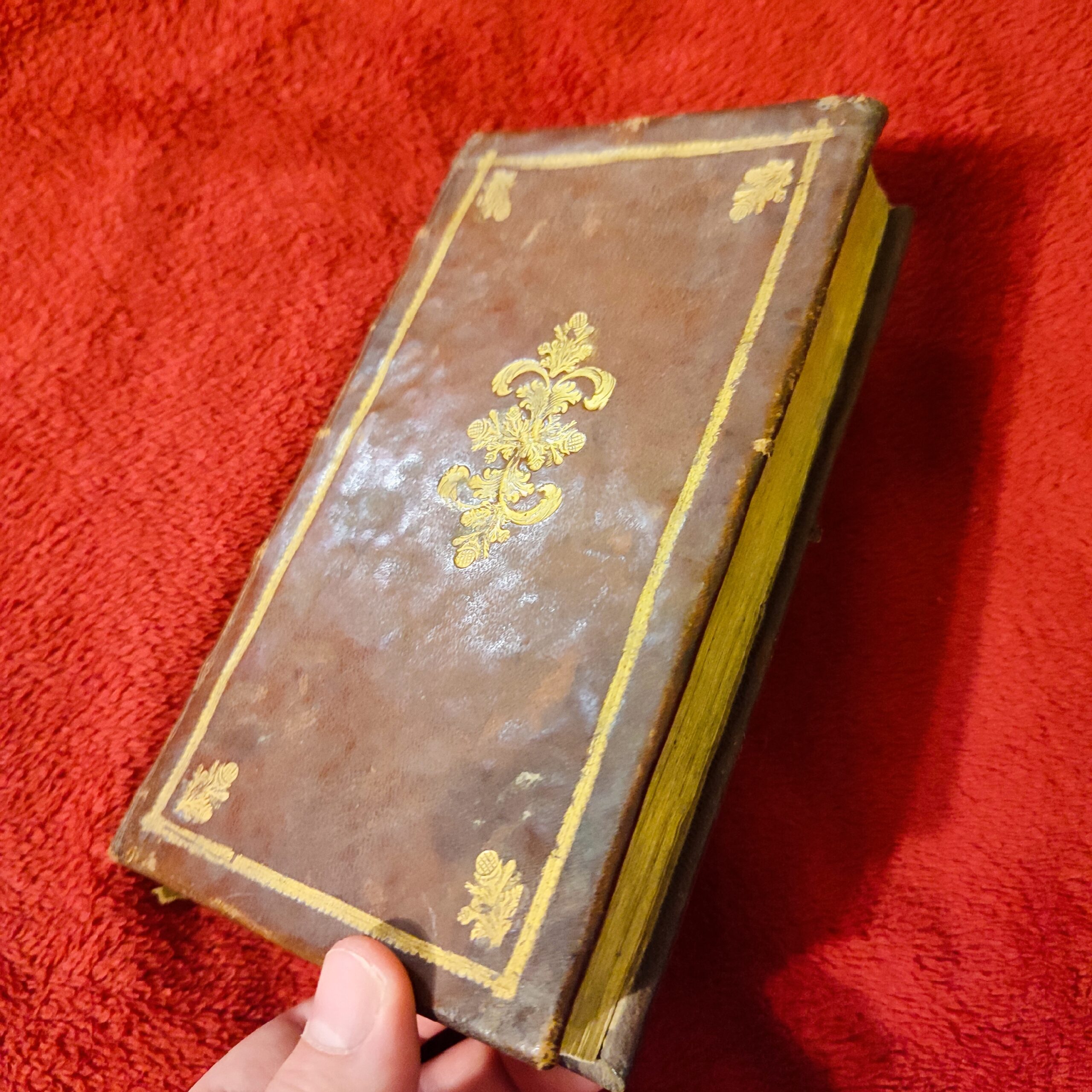 Oprawa twarda skórzana z epoki, ze żłobionymi i pozłacanymi zdobieniami.