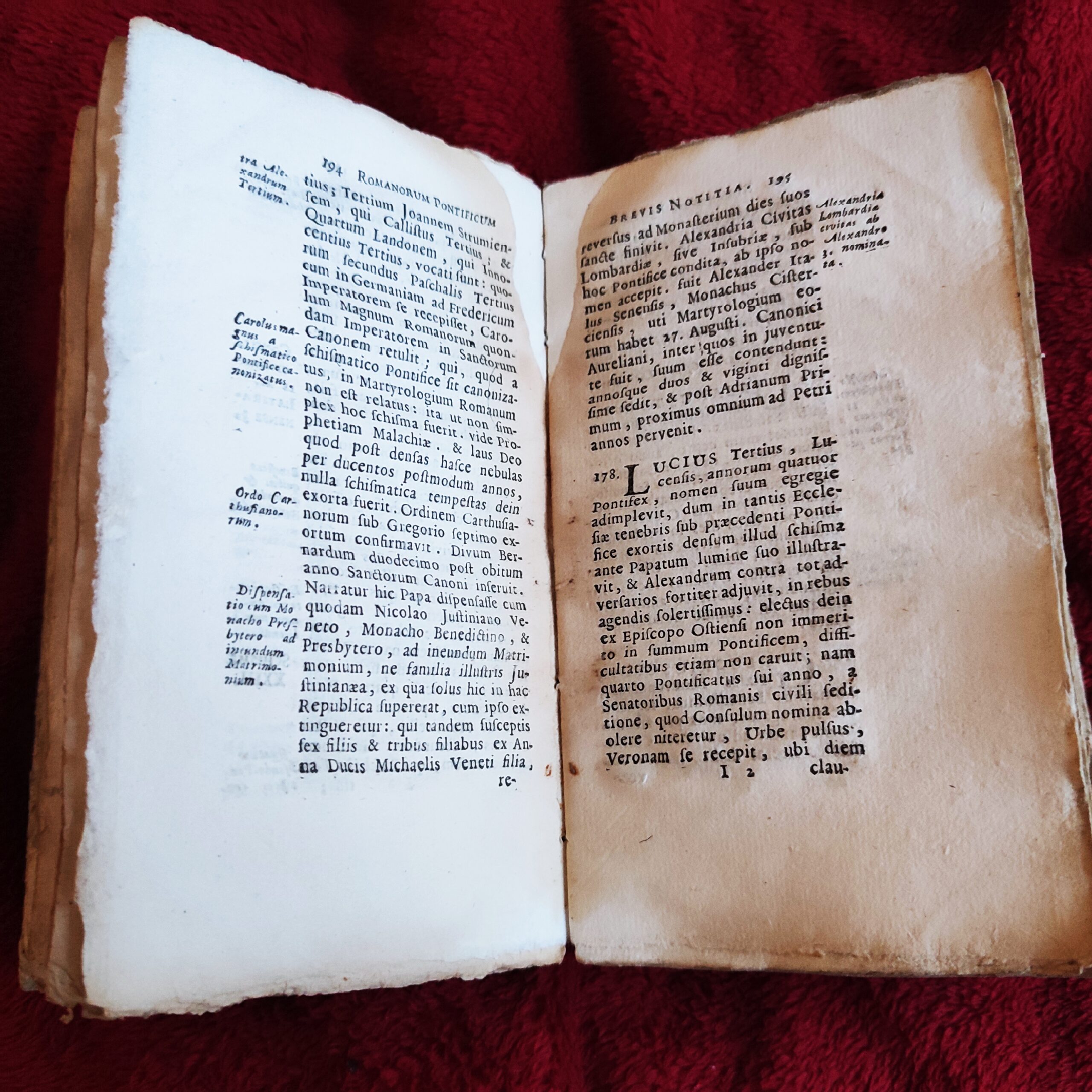 Drugie wydanie (pierwsze w 1724 roku w tym samym miejscu i u tego samego drukarza) znanego opracowania podejmującego historię papiestwa oraz liturgii.